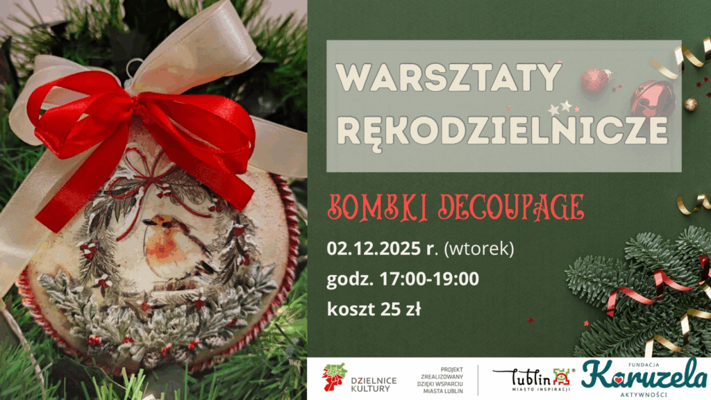 Podczas zajęć: poznasz technikę decoupage krok po kroku, wykonasz świąteczną bombkę z zimowymi motywami, spędzisz czas w twórczej, przedświątecznej atmosferze.
