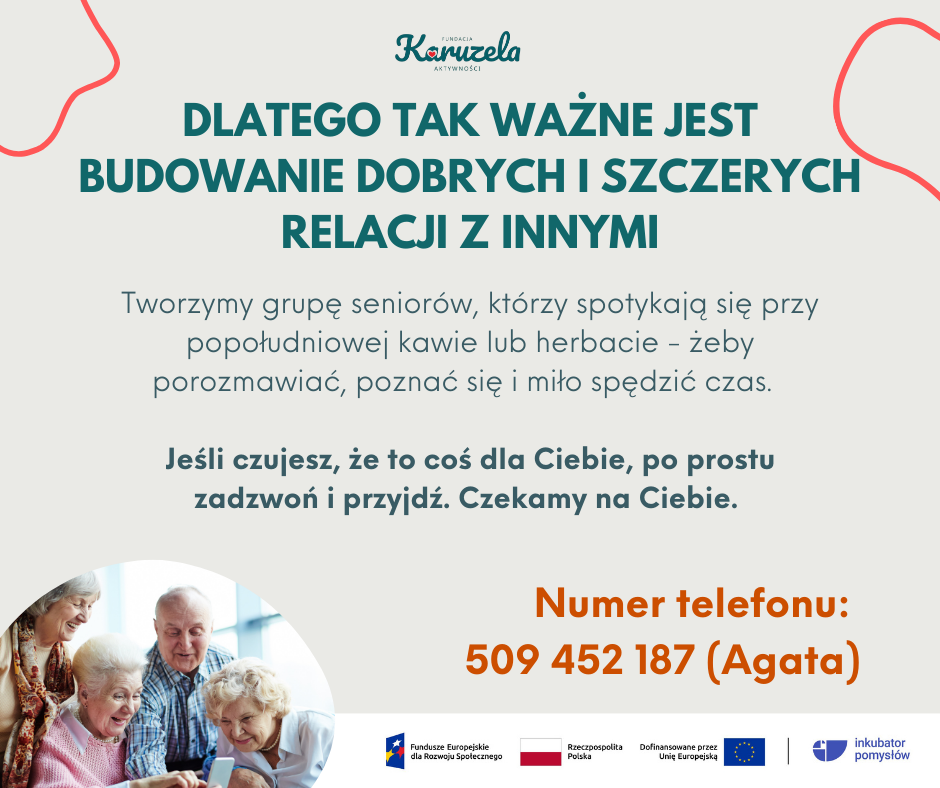 W Fundacji Karuzela Aktywności tworzymy kameralną grupę seniorów, którzy spotykają się przy popołudniowej kawie, herbacie (albo wodzie), żeby po prostu porozmawiać, poznać się i spędzić miło czas.