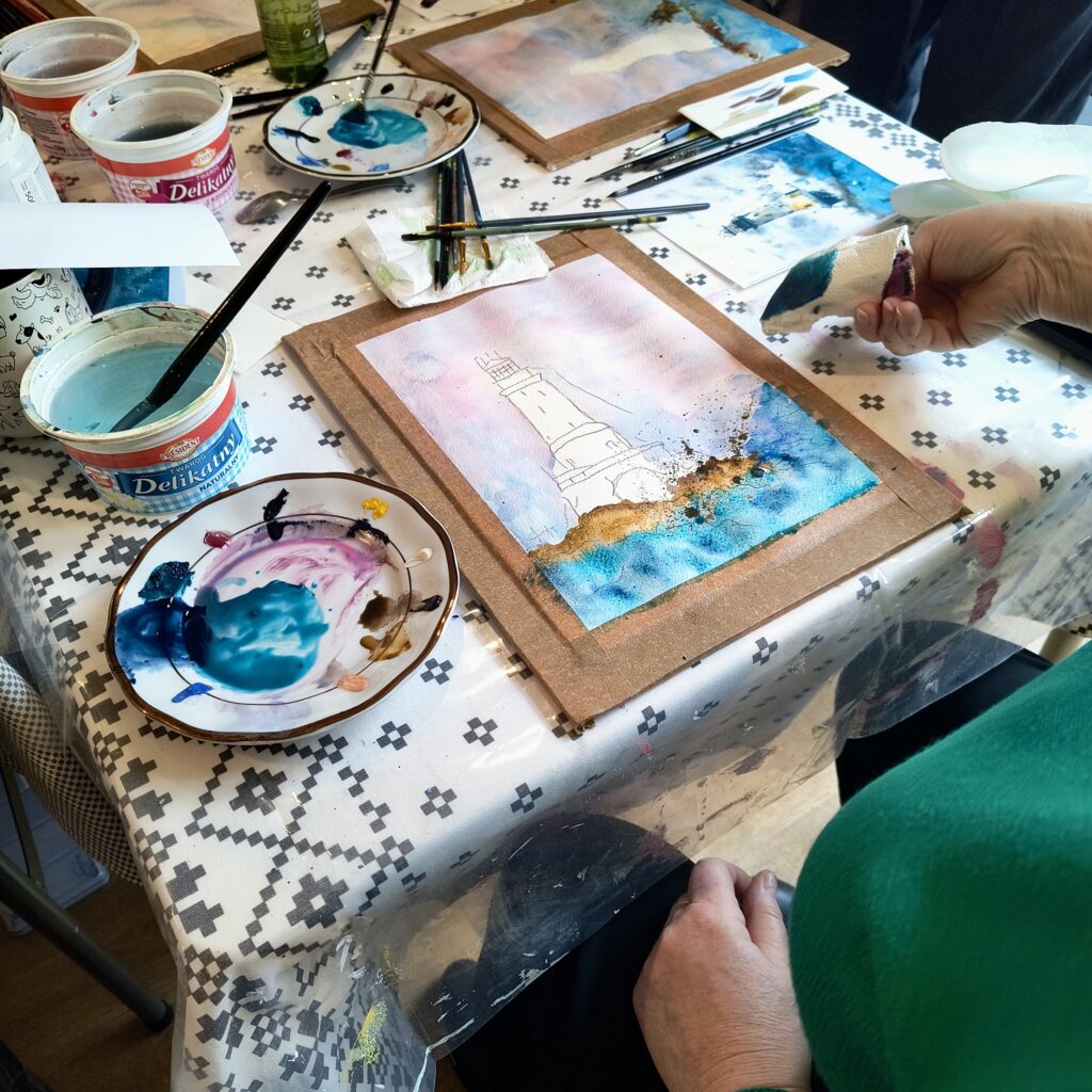 Przez ostatnie trzy soboty w Drugim Miejscu odbywały się warsztaty malarstwa akwarelowego. Uczestnicy mieli okazję poznawać, rozwijać i doskonalić tę wyjątkową technikę pod okiem prowadzącej Eweliny Zajączkowskiej. Dzięki jej wiedzy i zaangażowaniu w przestrzeni pojawiło się nieco koloru, którego zdecydowanie brakowało w te ponure, listopadowe dni.