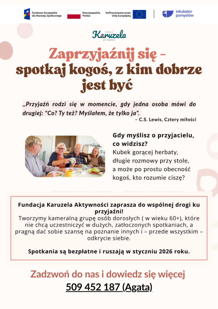 Fundacja Karuzela Aktywności zaprasza osoby w wieku 60+ na kameralne, ciepłe spotkania, w których najważniejsze są… życzliwość, spokój i obecność drugiego człowieka.